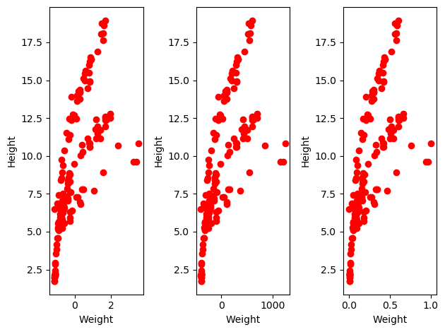 One other tip and trick that is good to follow is that of data normalization. Sometimes, our data might be on entirely different scales from one another! In our dataset, we can see this with the difference between height and weight. Weight is in grams while height is in cm, and there are completely different possible ranges for each feature. Therefore it can be good to normalize each feature, generally so that each is mean centered with a standard deviation of 1, so that no feature is viewed as more important than any other simply due to its magnitude. Some other ways are: just mean centering the data, and scaling it to range from zero to one. these look like this: