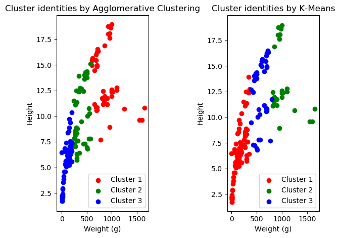 ax1.set_title('Cluster identities by Agglomerative Clustering')