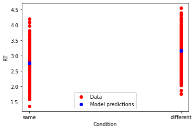 We can also fit a model to our categorical variables, such that we can see if there’s a difference in RT between the same and different conditions. To do so, we need to set up a dummy variable for our condition, then fit the linear model.