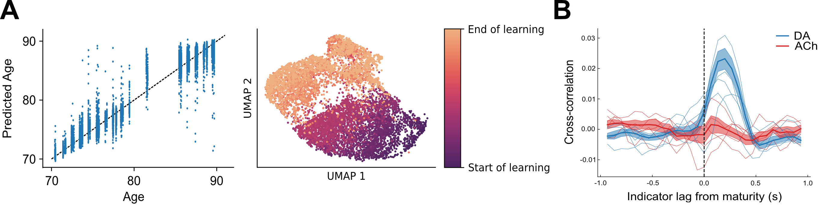 In a recent paper with the Mooney lab at Duke, investigating dopaminergic reinforcement of song, we used VAE-based metrics to probe the link between song quality and dopamine release in the zebra finch song basal ganglia. In this work, we confirm dopamine’s evaluative role in self-reinforced learning. I am additionally applying our Ouroboros model to a separate vocal learning dataset (work in prep) to how calcium release in the song basal ganglia reflects learning.